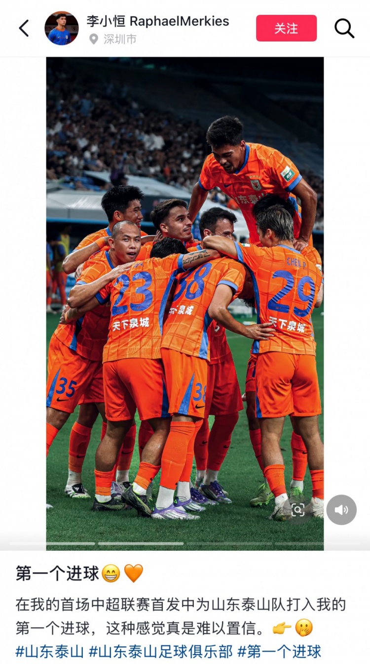 今日李小恒社媒曬照紀(jì)念自己中超首球,他為照片配文寫道:“在我首次中超首發(fā)的比賽就為山東泰山打入我的第一個(gè)進(jìn)球,這種感覺真是難以置信?!?/span>