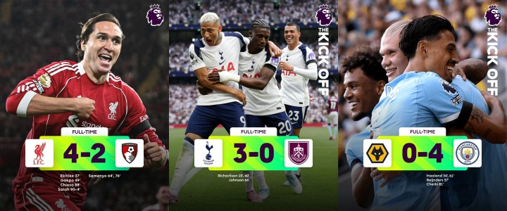 08月18日訊 新賽季英超首輪基本結(jié)束,傳統(tǒng)BIG6的比賽都已經(jīng)打完,其中利物浦4-2伯恩茅斯、曼城4-0狼隊(duì)、熱刺3-0伯恩利、切爾西0-0水晶宮、阿森納1-0曼聯(lián)。