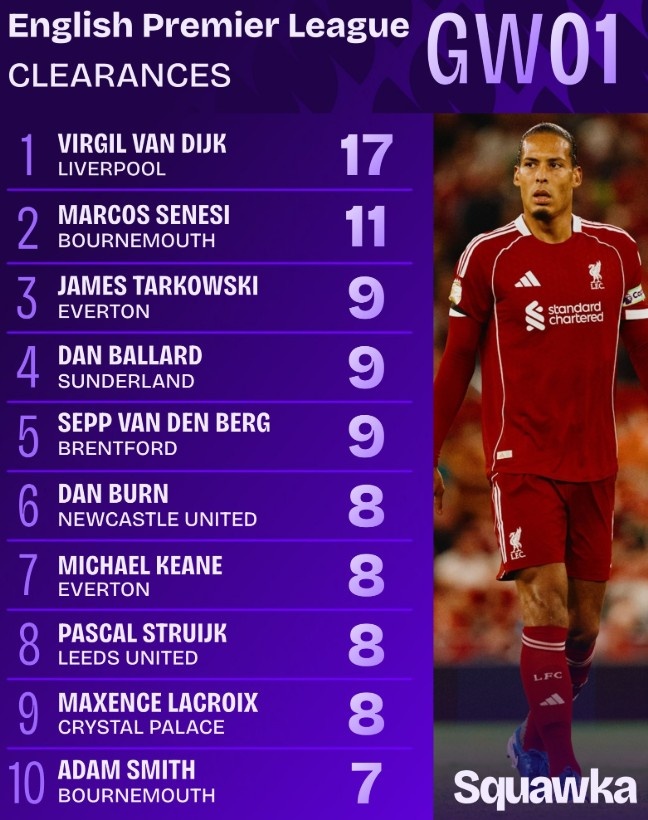 8月20日訊 新賽季英超首輪比賽已經(jīng)結(jié)束了全部爭奪,根據(jù)Squawka的數(shù)據(jù)統(tǒng)計,利物浦中衛(wèi)范迪克是本輪解圍次數(shù)最多的球員。