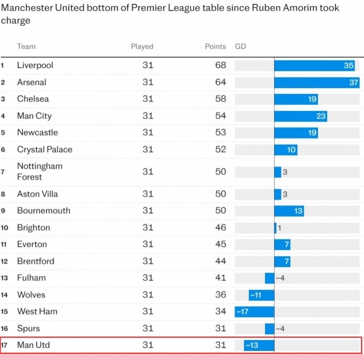 自阿莫林上任以來,曼聯(lián)在英超積分墊底、凈勝球倒數(shù)第二(除了已降級(jí)的三隊(duì))。