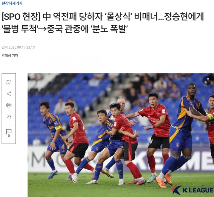 09月17日訊 亞冠精英聯(lián)賽東亞區(qū)第1輪,成都蓉城客場1-2不敵蔚山HD,賽后韓媒spotv聲稱,有中國客場球迷朝韓國球員鄭升炫投擲水瓶。