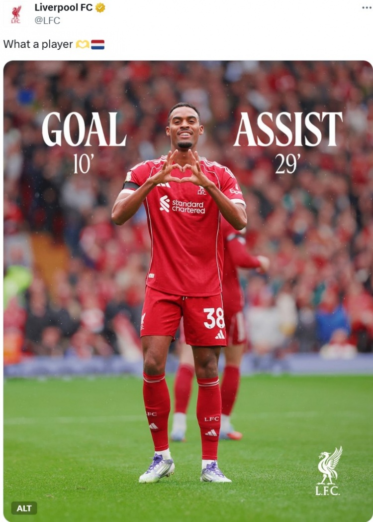本場比賽赫拉芬貝赫在第10分鐘先拔頭籌,隨后在29分鐘助攻?;倏似崎T,利物浦官推也曬出赫拉芬貝赫海報,夸贊道:“多棒的球員!”