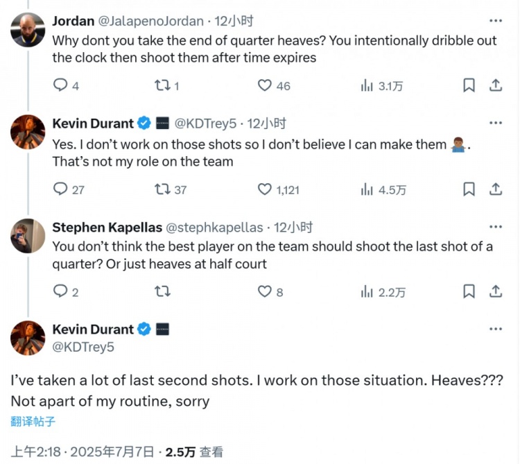 杜蘭特:“我投過很多壓哨球。我會(huì)針對(duì)那種情況進(jìn)行訓(xùn)練。全場(chǎng)超遠(yuǎn)投???這可不是我日常訓(xùn)練的一部分,抱歉?!?/p>