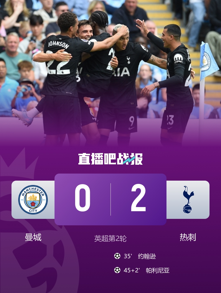 8月23日訊 北京時(shí)間19:30,英超第2輪曼城vs熱刺,比賽在伊蒂哈德球場(chǎng)打響!上半場(chǎng),馬爾穆什造險(xiǎn),努里22分鐘傷退;哈蘭德手術(shù)刀直塞,馬爾穆什失良機(jī)!特拉福德送禮,帕利尼亞破門!下半場(chǎng),雙方均無建樹。最終,曼城主場(chǎng)0-2不敵熱刺,熱刺開賽2連勝暫登頂。