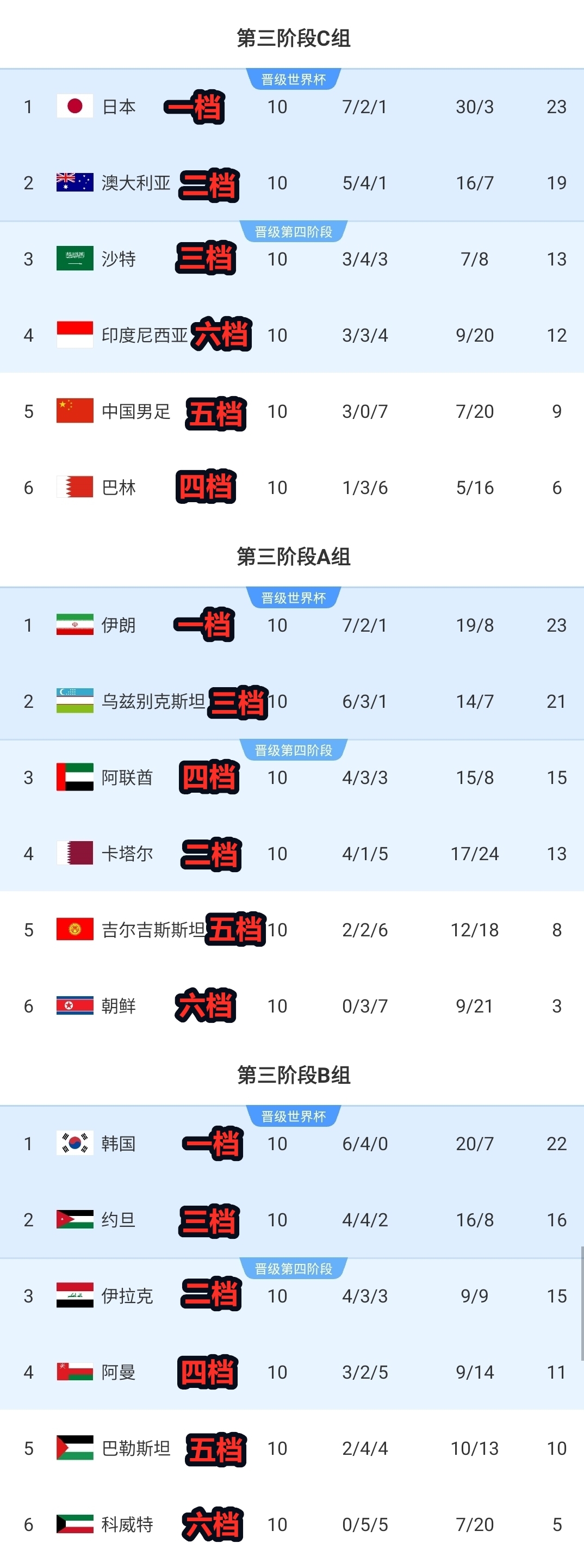 國足等三支五檔隊,最終全部排名第5;僅印尼一支六檔隊逆襲,進(jìn)入第四階段。