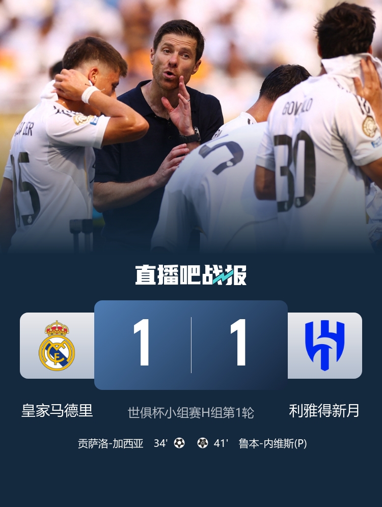 下半場補(bǔ)時7分鐘。最終全場比賽結(jié)束,皇馬1-1新月。