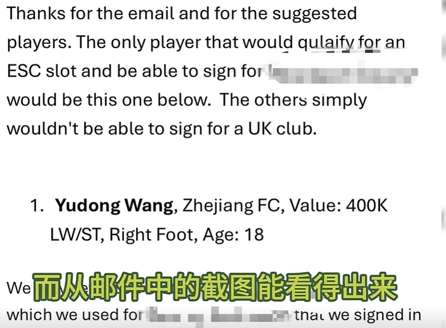 博主并未在視頻中透露該俱樂部的名字,也在郵件關(guān)鍵信息中打上了碼。但據(jù)博主的介紹,該俱樂部應(yīng)該不會是英超俱樂部,很有可能是相對低級別的俱樂部。