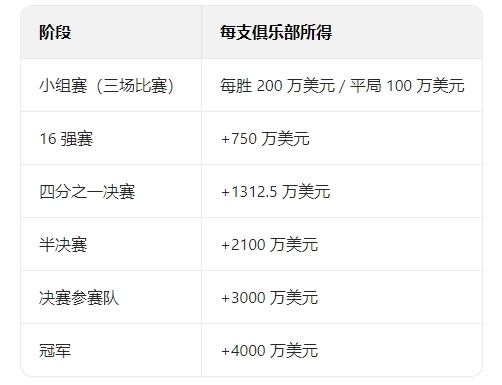 世俱杯小組賽階段贏球每場200萬美元,平局100萬美元。