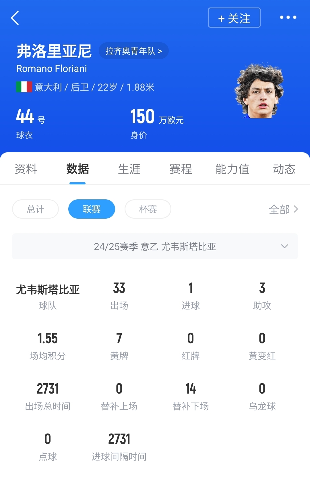 羅馬諾-弗洛里亞尼-墨索里尼,現(xiàn)年22歲,司職右后衛(wèi),上賽季被拉齊奧外租至尤韋斯塔比亞效力,共在意乙出戰(zhàn)33場比賽,貢獻1球3助。