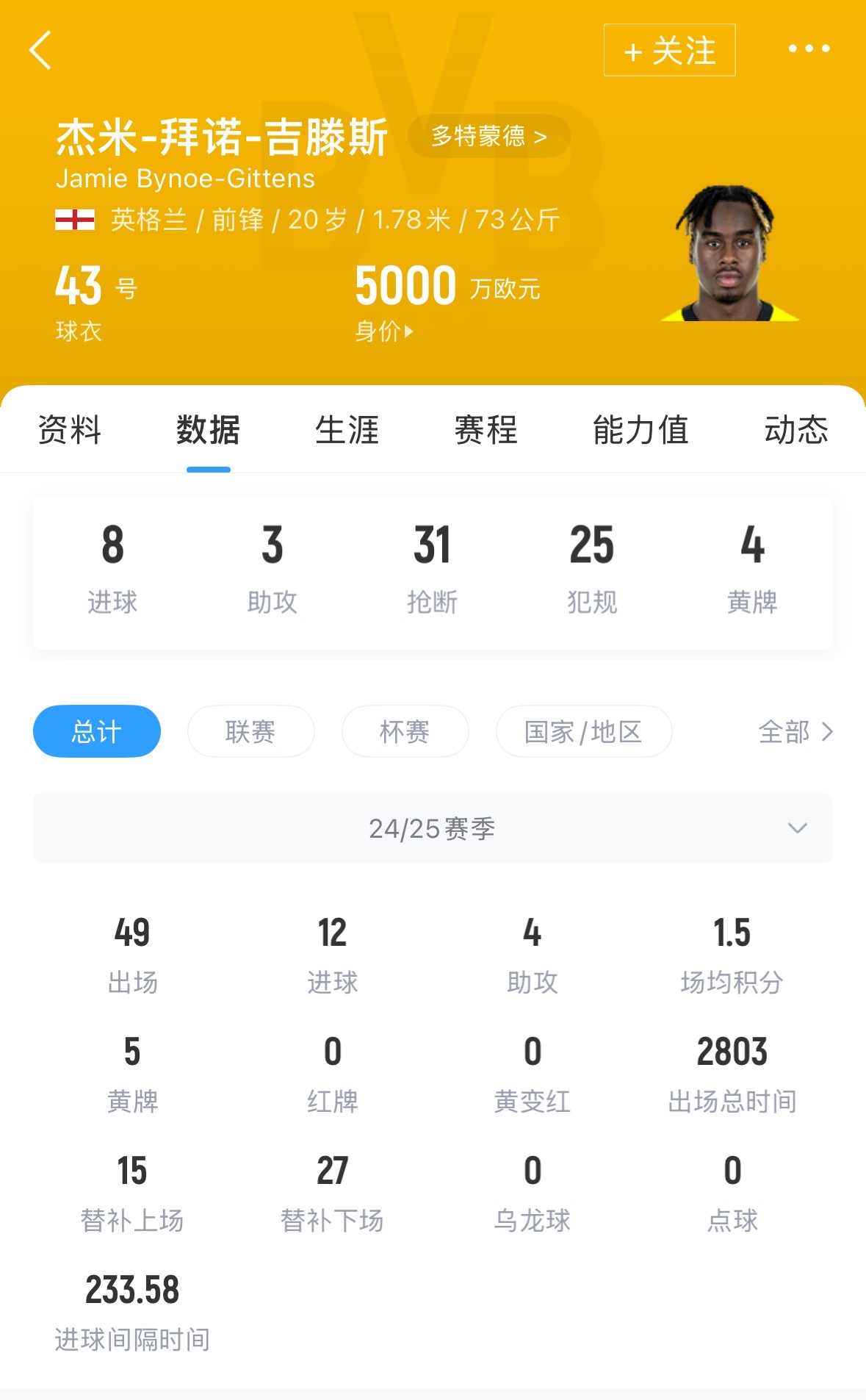 本賽季至今吉滕斯各賽事代表多特出戰(zhàn)49場比賽,打進(jìn)12球助攻4次。目前球員德轉(zhuǎn)身價(jià)為5000萬歐。
