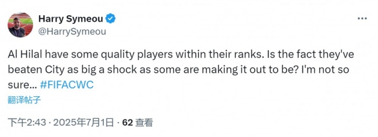 英國記者Harry Symeou在社交媒體上寫道:“利雅得新月陣中有一些實(shí)力不俗的球員,他們擊敗曼城的事實(shí),真的像一些人說的那樣令人震驚嗎?我不太確定……”