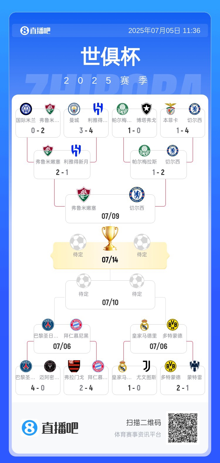 07月05日訊 世俱杯1/4決賽今日兩場(chǎng)比賽結(jié)束,切爾西2-1帕爾梅拉斯,弗魯米嫩塞2-1利雅得新月,先行晉級(jí)四強(qiáng)。