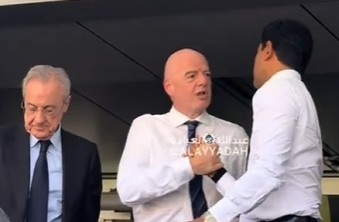 賽后,巴黎主席納賽爾和皇馬主席弗洛倫蒂諾、國際足聯(lián)主席因凡蒂諾擁抱致意。