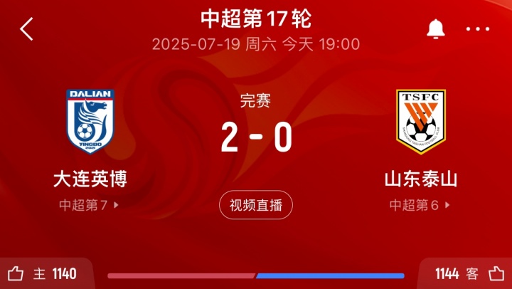 07月19日訊 今日,中超第17輪,泰山0-2不敵大連英博,本場比賽是泰山B隊主帥韓鵬作為泰山一線隊代理主帥帶隊的首場比賽。