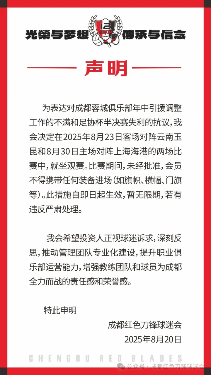 為表達對成都蓉城俱樂部年中引援調(diào)整工作的不滿和足協(xié)杯半決賽失利的抗議,我會決定在2025年8月23日客場對陣云南玉昆和8月30日主場對陣上海海港的兩場比賽中,就坐觀賽。比賽期間,未經(jīng)批準(zhǔn),會員不得攜帶任何裝備進場(如旗幟、橫幅、門旗等)。此措施自即日起生效,暫無限期,若有違反嚴肅處理。